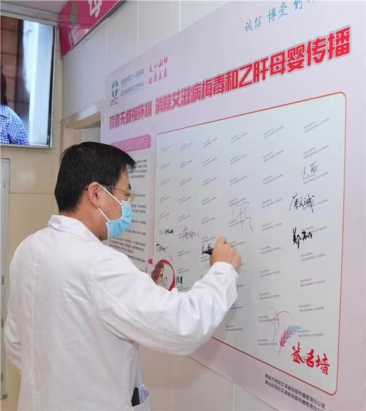 由分管院领导刘阳副院长带头,院感科、医患关系办、公共卫生科等职能科室,妇产科、儿科、检验科、药剂科、门诊部等相关临床医技科室人员,以及“小雨帮帮团的志愿者”纷纷在“营造无歧视环境、消除艾滋病梅毒和乙肝母婴传播”的签名墙上,慎重地签下了自己名字,郑重承诺:将做营造无歧视环境,消除三病母婴传播的倡导者、践行者。